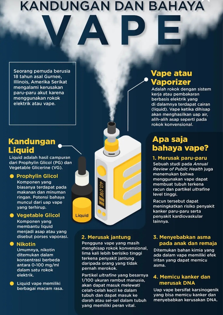 - Kandungan bahan kimia lain pada vape seperti logam dan senyawa organik memang cenderung lebih rendah jika dibandingkan dengan rokok tembakau. Namun, besar kandungannya tetap berbahaya dan belum diatur.